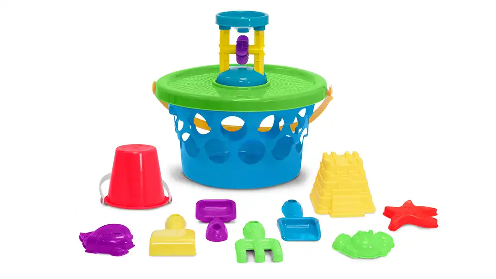 Egy nap a strandon még jobb ezzel a készlettel, amely tartalmaz egy homok/víz malmot, egy kastélyformát, három kis homokformát, négy homokszerszámot, egy kis vödröt, egy vödörfedelet, amely homokszitaként is funkcionál, és egy nagy méretű strandvödröt.