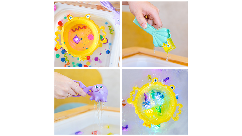 A gyerekek kanalazhatnak, szűrhetnek és szitálhatnak ezekkel az orvosi minőségű szilikonból készült állatkákkal. A kicsik fejleszthetik a "kéz-szem koordinációjukat", miközben élvezik az érzékszervi játékot a "Puffer Pal Bővíthető Szűrővel", a "Clamp" Kagyló Mini Fogóval" és a "3 az 1-ben Scooper Tintahallal".