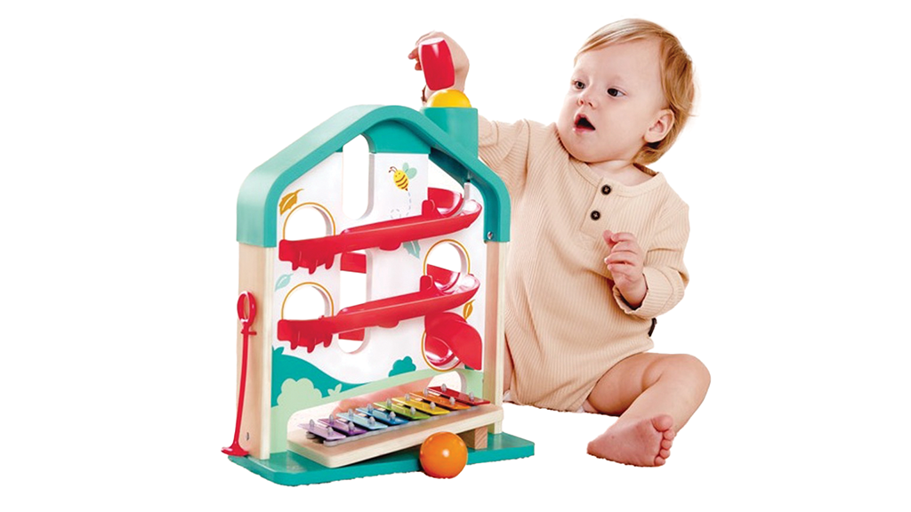 A kicsik multifunkcionális játékba merülhetnek el ezzel a játékkészlettel. Amint a totyogók a fa golyókat a tetején lévő kéményen keresztül leütik, hogy azok lecsússzanak a kanyargós pályán és áthaladjanak a xilofon színes hangjain, felfedezhetik az alapvető zenei fogalmakat. A készlet két golyót, egy eltávolítható xilofont és egy verőt tartalmaz.