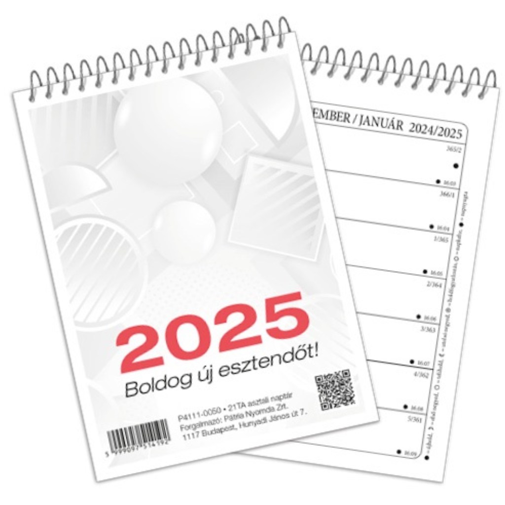 A 2025-ös asztali naptár praktikus és kompakt megoldás a mindennapi teendők nyomon követésére. A 100×140 mm-es, álló formátumú naptár tökéletes választás azok számára, akik szeretik a rendezett, áttekinthető feljegyzéseket. A heti beosztású naptár 8–18 óra közötti időintervallummal segít megtervezni a napirendedet, miközben a magyar név- és ünnepnapok feltüntetése, a hónapáttekintők és a holdfázisok megjelenítése további hasznos információval szolgál.