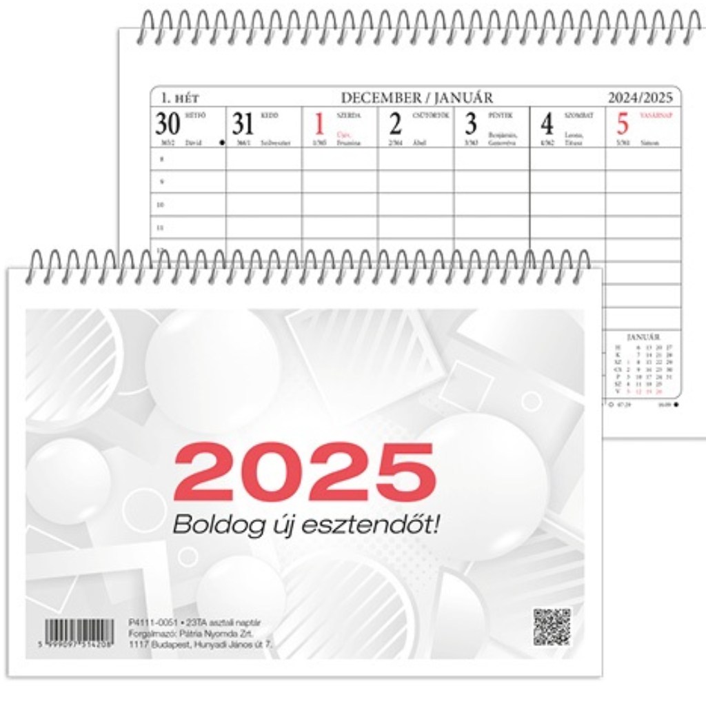 A 2025-ös asztali naptár praktikus és áttekinthető megoldást kínál a mindennapi időbeosztáshoz. A 204×140 mm-es formátumú, heti beosztású naptár elegendő helyet biztosít a napi teendők, időpontok és megjegyzések rögzítésére, 8–18 óra közötti időintervallumot lefedve. A magyar név- és ünnepnapok feltüntetése mellett hónapáttekintők, holdfázisok, valamint az eltelt és hátralévő napok száma segítenek még jobban megszervezni a napjaidat.