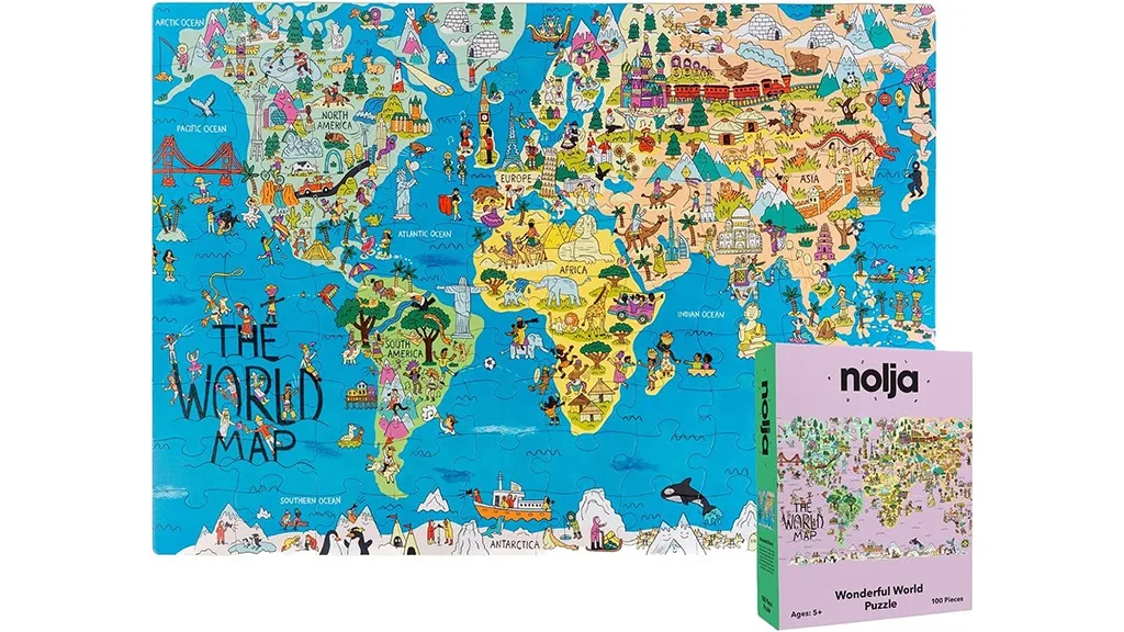 Ez a 100 darabos puzzle egy színes illusztrációt nyújt a világtérképről, melyen emberek, természet és állatok grafikái láthatók. A gyerekek a mellékelt ténylap segítségével megismerhetik a különböző országokat, amely kiemeli egy nemzet diverzitását, hagyományait, és rejtett kincseit.