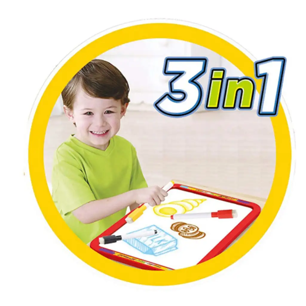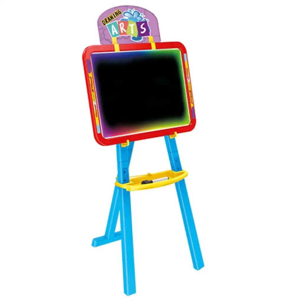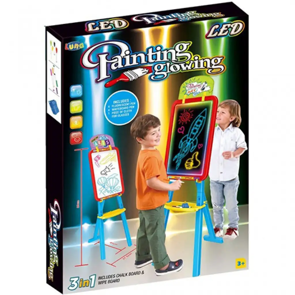 Különleges rajztáblát szerezhetsz be gyermeked számára amely kétoldalas panellel rendelkezik és a LED világításnak köszönhetően gyermeked számára egy új dimenzió nyílhat meg a rajzolás terén. A tábla tartozékaiként fluoreszkáló tollakat és táblafilceket is találhatsz amelyekkel gyermeked azonnal megkezdheti az alkotást. A tábla LED világítása elemmel működik amelyeket a készlet nem tartalmaz. A táblát a méretéből adódóan gyermeked akár már három éves kortól használatba veheti és megkezdheti az alkotást.