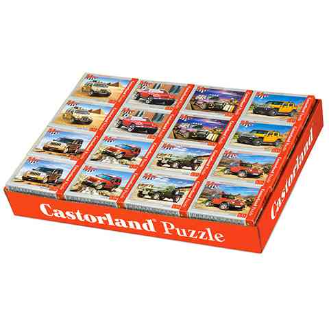 Ezeken a kirakós játékokon a legvagányabb autók, pontosabban terepjárók csodálhatók meg. A nagymúltu Jeep-től a népszerű Hummer-ig a legvagányabb környezetben csodálhatjuk meg a járgányokat. A tizenöt centitől alig nagyobb képeket ötvennégy darabból lehet kirakni, és több változatban is elérhető, így a gyerekek akár gyűjthetik is őket. A Castorland puzzle a kiváló minőségű nyomtatási technológiának köszönhetően éles és élénk színű képeket eredményez, a puzzle elemek pontosan illeszkednek, így az elkészült kép bármely szoba legszebb dísze lehet.