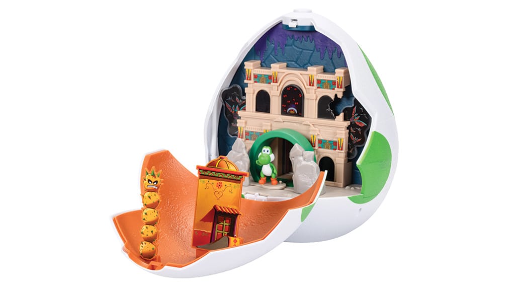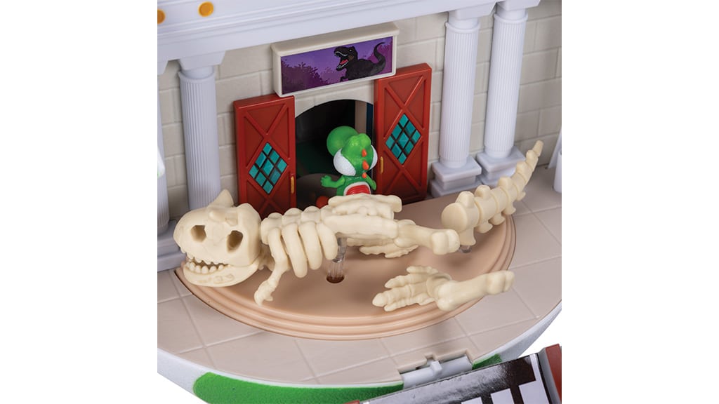 Törd fel ezt a zöld Yoshi tojást, és fedezz fel benne egy lenyűgöző, kétoldalas játékszettet! A New York oldalon egy történelmi múzeum elevenedik meg, teljes, omladozó dinoszaurusz csontvázzal, míg a Dry Outpost oldal egy varázscsövet, gombnyomásra mozgó denevéreket és egy felbukkanó Pokey-t tartalmaz. A szett része továbbá egy 3,8 cm-es Yoshi és egy Fire Mario akciófigura is, így a gyerekek azonnal belevethetik magukat a kalandokba. Ez a játékszett tökéletes választás minden Super Mario rajongónak, hiszen izgalmas, interaktív játékélményt nyújt, miközben a részletgazdag kidolgozásnak köszönhetően a gyűjtők polcán is remekül mutat.