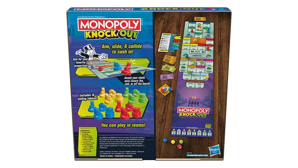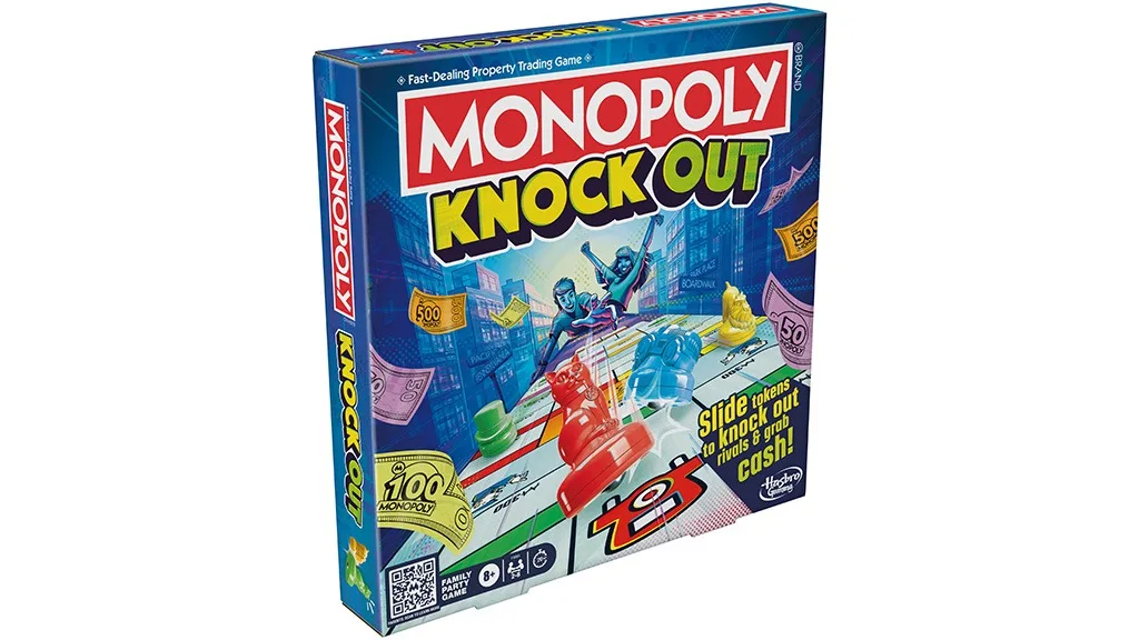 A Monopoly Knockout a 8 éves és annál idősebb játékosok számára készült, egyszerre 2-8 játékos részvételével, így ez ideális játék családi összejövetelekre és játékestekre. Ez a könnyed stratégiai játék tartalmazza a játéktáblát, 16 csúszó zsetont, egy Börtönben kártyát, egy hivatkozási kártyát, négy fordulójelzőt, egy pénzcsomagot és egy játék útmutatót.