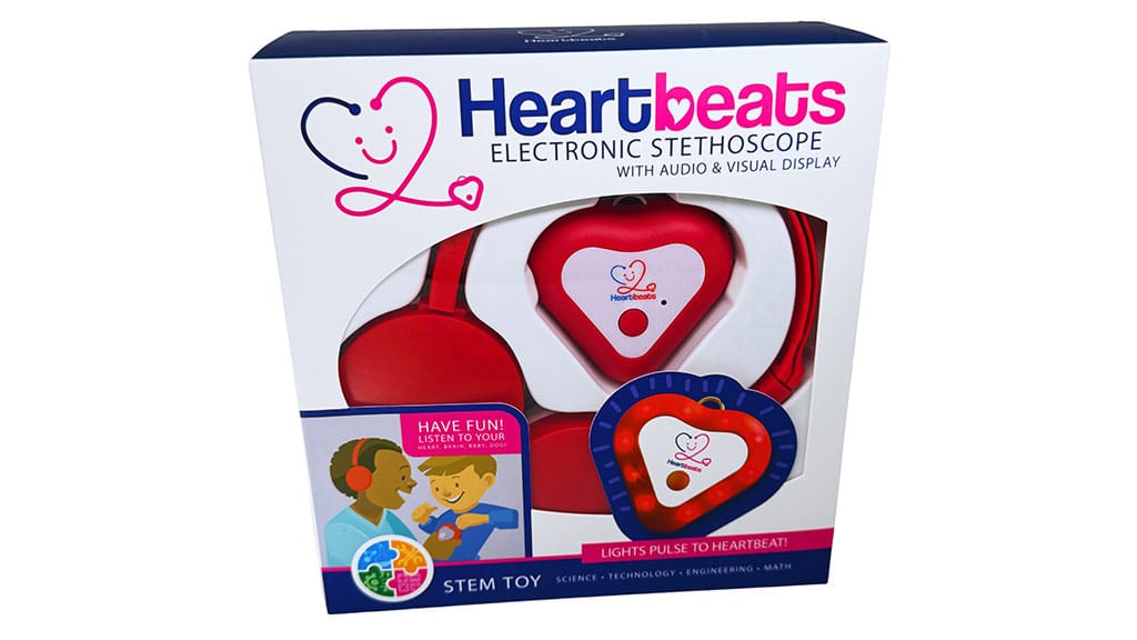 Az 5 éves és idősebb gyerekek számára tervezett Heartbeats Brand Elektronikus Sztetoszkóp egy új megközelítése a gyerekeknek szánt orvosi eszközöknek, akik szívesen játszanak orvososat. A hagyományos sztetoszkóp fülhallgatói és harangja helyett ez a STEM játék fülre helyezhető fejhallgatóval és szív alakú haranggal rendelkezik, amely pulzusokat, beleértve a szívveréseket és más rezgéseket, továbbít a fejhallgatóba egy aux kábelen keresztül. A gyerekek használhatják az Elektronikus Sztetoszkópot, hogy meghallgassák saját szívverésüket, de a készlet tartalmaz egy útmutatót is, amely más oktatási tevékenységeket is bemutat, amelyeket a gyerekek a sztetoszkóppal végezhetnek, például háztartási hangok hallgatása, activity játék, labirintusok navigálása és még sok más. A készlet tartalmaz egy csuklópántot is, így a gyerekek mindig kéznél tarthatják az elektronikus harangot.