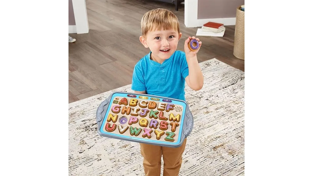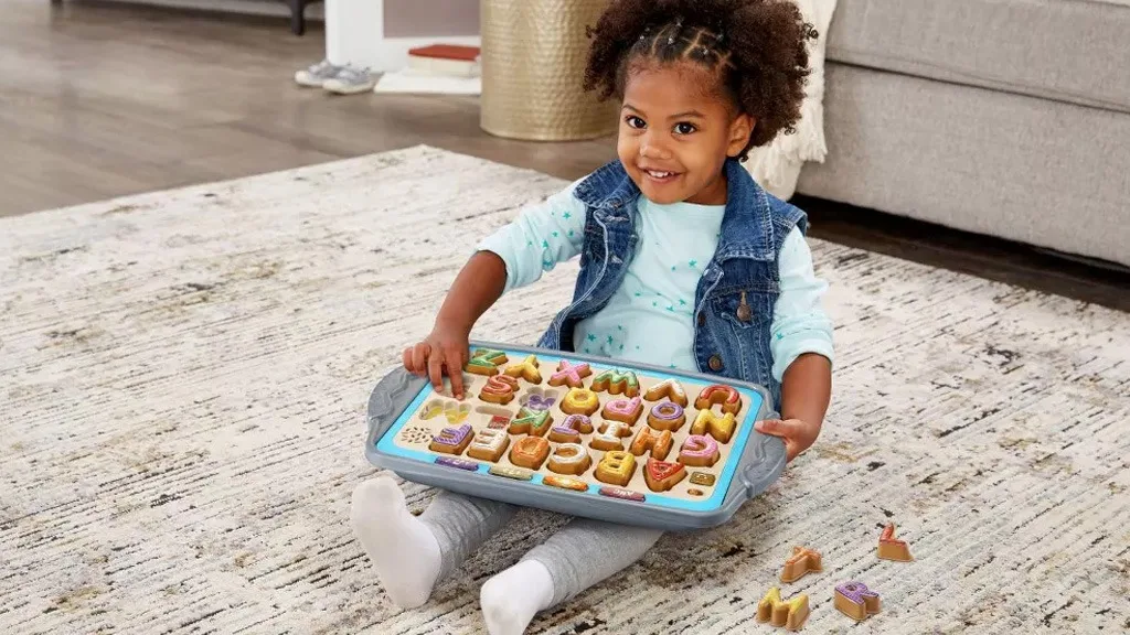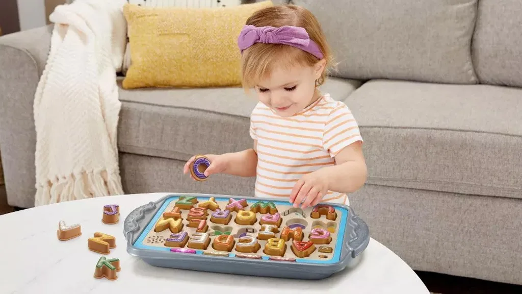 A játék úgy néz ki, mint egy sütőlap fogantyúkkal, és tartalmaz 26 sütemény-témájú műanyag betűt. Minden betűhöz tartozik egy meghatározott „máz” szín, és a tálca megfelelő körvonalán egy íz képe látható. Például a „V” betűs süti fehér mázzal és vanília képpel van ellátva a tálca részén, míg a „P” betű rózsaszín mázzal és egy barack ikonnal. A sütik narancssárga, lila, zöld, rózsaszín, sárga és fehér színűek; minden süti más-más alakú és mintájú szórócukrokkal van díszítve, így a gyermeked nem fog megunni, hogy mindig ugyanazokat a tárgyakat nézze.