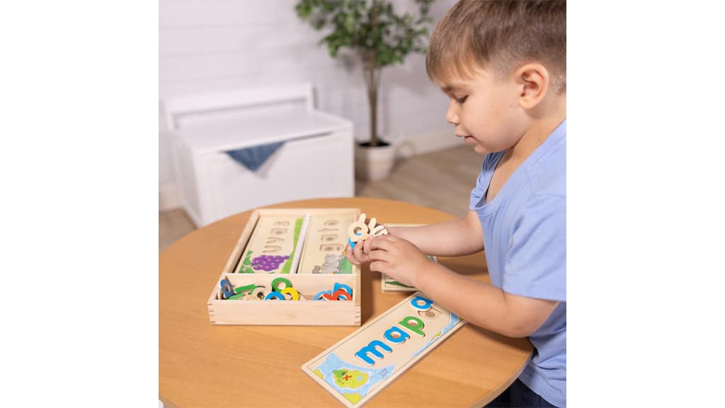 Gyerekek fa kirakó táblákba helyezik a betűket, hogy spanyol szavakat rakjanak ki, amelyek illenek a képekhez. A készlet tartalmaz nyolc kétoldalas táblát, 64 kisbetűt, valamint egy fa tárolódobozt a könnyű rendszerezéshez és tároláshoz. Ez a játék fejleszti a szókincset, a helyesírást és a finommotorikus készségeket, miközben szórakoztató módon ismerteti meg a gyerekeket a spanyol nyelvvel.