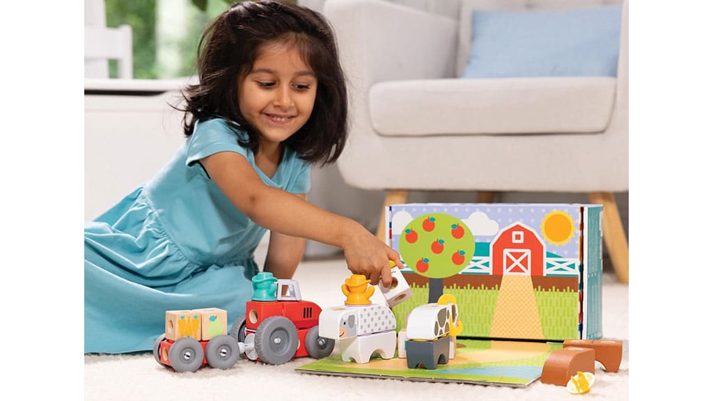 Készíts farmállatokat és felszereléseket az 56 darabos készlettel, amely építőkockákat, összekötő elemeket, figurákat, filc kiegészítőket és kerekeket tartalmaz. A csomagban megtalálható egy tehén, juh, malac, ló, csirke, valamint egy traktor pótkocsival, takarmány és szénabála is. Kifejezetten kis kezekhez és NAGY képzelőerőhöz tervezve: a nagy méretű fa építőkockák és filc kiegészítők tökéletesek arra, hogy a gyerekek építhessenek felfelé, lefelé és minden irányba, miközben szabadon engedik a fantáziájukat.
