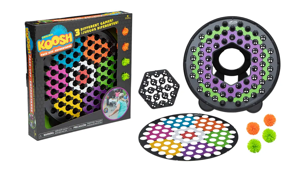 Kezdjük az alapokkal. A Koosh Face-Off minden szükséges eszközt tartalmaz egy epikus párbajhoz: négy Koosh labdát, egy kétoldalas/leválasztható céltáblát, és könnyen követhető utasításokat. A játék 6 éves és idősebb gyerekek számára készült, így kiváló kiegészítője a családi játékéjszakáknak, mivel a gyerekek a szülőkkel és nagyszülőkkel is játszhatnak, ami multigenerációs lehetőséget biztosít a kötődésre.