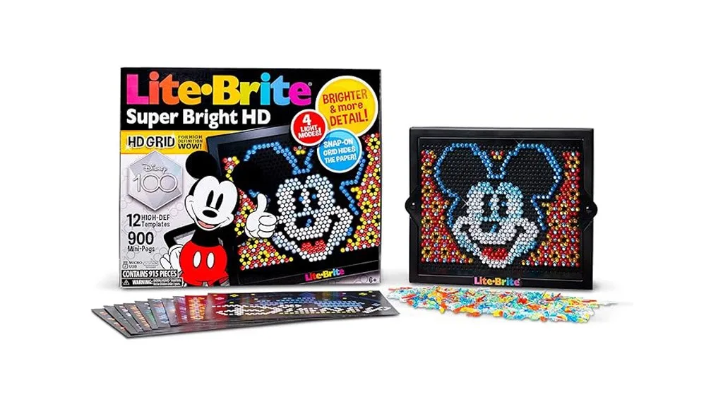 Ez a Disney-témájú Lite-Brite készlet magas felbontású kijelzővel és a legújabb LED technológiával rendelkezik, ami élénkebb színeket és tisztább képeket eredményez. Tartalmaz sablonokat, melyeken ikonikus Disney karakterek láthatóak, mint például Mickey Mouse, Donald Duck, Simba, és még több. A gyerekek váltogathatják a különböző fény módokat, hogy feldobják alkotásaikat.