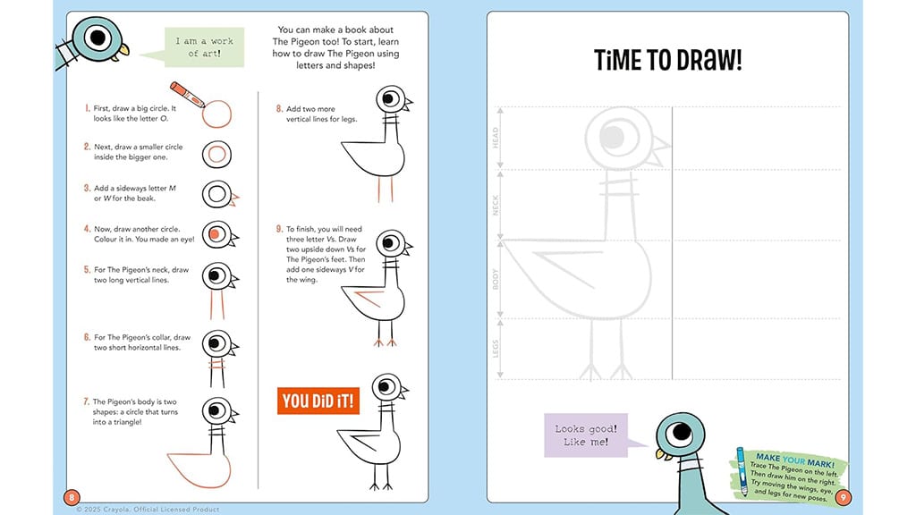 A könyv több mint 100 izgalmas tevékenységet kínál gyerekeknek, amelyek között szerepel például, hogy megtanulhatnak rajzolni, egy mókus-labirintusban navigálhatnak, rejtvényeket oldhatnak meg, valamint képregény-stílusú oldalakat színezhetnek ki. Minden oldal arra ösztönzi a gyerekeket, hogy új módokon fejezzék ki önmagukat, például írással, főzéssel, tánccal vagy saját művészetük megalkotásával. A könyv tartalmaz 50 matricát és egy kivehető posztert is, amelyet a gyerekek kiszínezhetnek és kitehetnek a szobájukba. A csomagban található kétoldalas Crayola filctollak színvilága megegyezik azzal a színpalettával, amelyet Willems használ a karaktereihez. Ez a könyv nemcsak szórakoztató, hanem fejleszti a kreativitást, az önkifejezést és a problémamegoldó képességet is, miközben órákon át leköti a gyerekeket.
