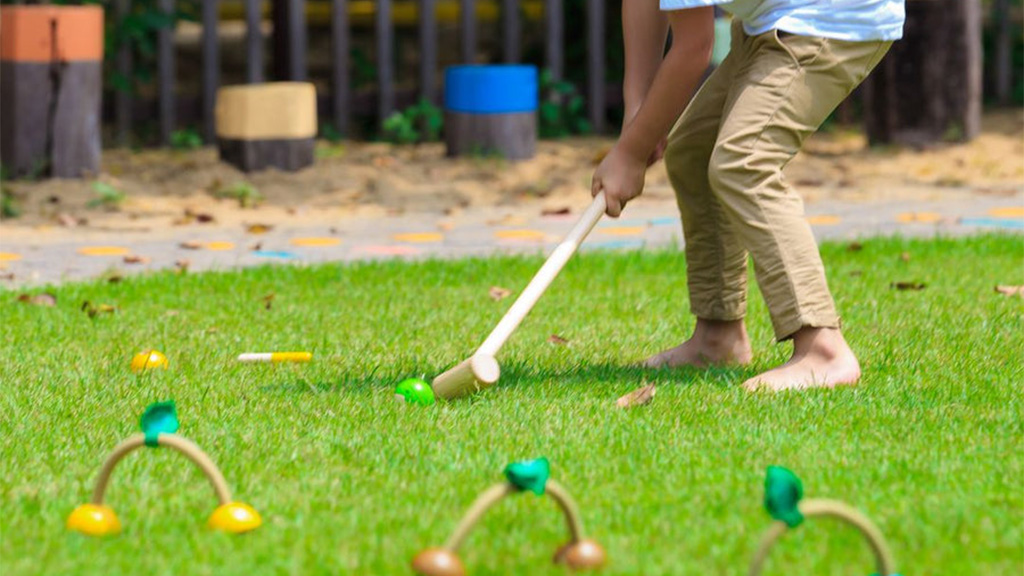 Ez a klasszikus kültéri játék gyermekbarát kialakítással rendelkezik, ami tökéletes a gyerekek számára. A készlet tartalmaz négy fa állatgolyót (madár, tigris, majom, és béka), két ütőt, négy kaput és egy végső állványt.
