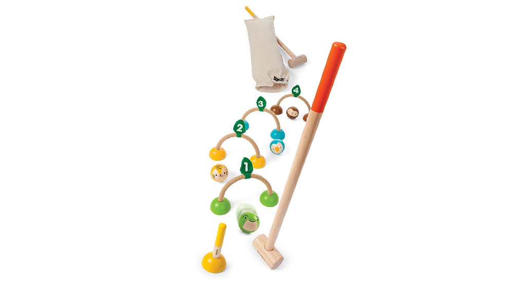 A PlanToy Croquet készlete fenntartható csavart visz a klasszikus kültéri játékba. A kicsik megtanulhatják a játékot a fa készlet négy állat-témájú labdájával, két ütőjével, négy kapujával és egy végső állvánnyal.