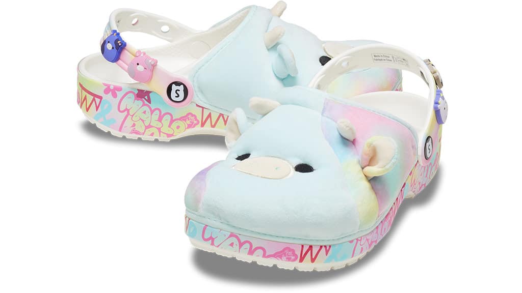 A kollekcióban található lábbeli kicsiknek és felnőtteknek egyaránt, így mindenki megtalálhatja az új kedvenc, kényelmes lábbelijét. Gyerekek és felnőttek egyaránt felvehetik a klasszikus Squishmallows klumpákat, amelyek fehérek és rengeteg Squishmallows barátot ábrázolnak a sarkuk körül. Minden pár klasszikus stílusú klumpa négy nagy méretű Jibbetz-zel érkezik, amelyek a gyerekek kedvenc Squishmallows figuráit ábrázolják. Ezeknek a klumpáknak a sarokpántjai is plüssből készültek, ami még több Squishmallows kényelmet biztosít.
