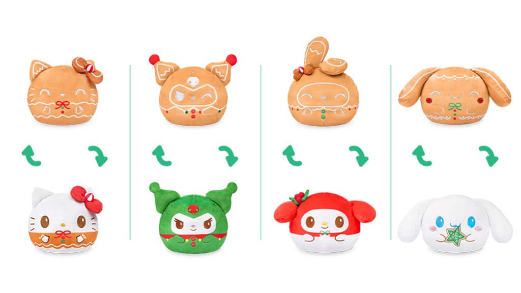 Ez a kollekció a következő karaktereket tartalmazza: Hello Kitty, My Melody, Kuromi és Cinnamoroll. A plüssfigurák kifordíthatóak, egyik oldalukon a karakterek mézeskalács változatai, míg a másik oldalon az ünnepekre felöltöztetett verzióik találhatók. Ez a különleges kollekció tökéletes ajándék lehet a rajongók számára, hiszen a karakterek két különböző megjelenésben is élvezhetők. A plüssök puha anyagból készültek, így nemcsak dekoratívak, hanem kellemes tapintásúak is. Az ünnepi hangulatot tovább fokozza a karakterek vidám és színes megjelenése, amely minden korosztály számára örömet okozhat.