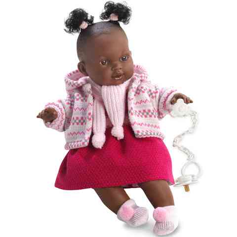 Az egzotikus, kedves arcú Adis kislány baba minden gyermeknek azonnal el fogja nyerni a tetszését, hiszen szép, részletgazdag kidolgozásának köszönhetően megtévesztően hasonlít az igazi néger gyermekekre. Göndör tincseit tartó hajgumiját, kardigánját, sálját és bojtos zokniját is világos rózsaszínben álmodták meg a tervezők, ami kiemeli a baba gyönyörű bőrszínét. Szoknyácskája pink színű, így szettje tökéletesen összeillik. Ha kiveszed Adis szájából a cumit sírni kezd, ami annak visszahelyezésével megszüntethető.