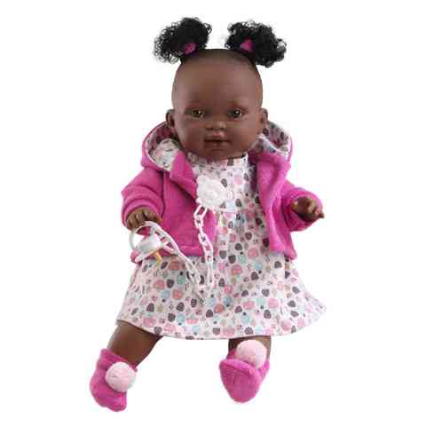 A síró babák közül az egyik legszebb ez a néger baba. Karakteres, kedves arca, játékos mintájú ruhácskája mosolyt csal mindenki arcára. A ruházat színvilága a sokak által nagyon kedvelt rózsaszínre épül, melyet még kedvesebbé tesz a pom-pomos zokni és kabátka egyszínűsége. A ruha mintázata megtalálható a kapucni bélésében is. A baba cumijához cumilánc és csíptető is tartozik. Amikor a cumit a baba szájába helyezzük, a baba, úgy, mint az igazi babák, abbahagyja a sírást. A baba teste textilből készült, ebben van elhelyezve a síró hang adására alkalmas eszköz.