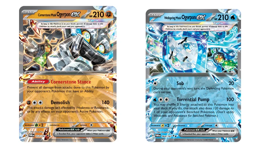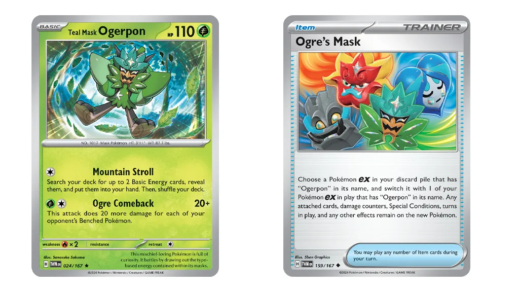 Több Pokémon is debütál a DLC-ből, beleértve az Okidogi-t, Munkidori-t és Fezandipiti-t! Az új TCG kiegészítő a Legendás Pokémon Ogerpon-t is bemutatja négy különböző Tera Pokémon ex-ként, Fű, Víz, Harci és Tűz típusokkal, az ő négy maszkja alapján. A játékosok különböző típusú Ogerpon ex-ekkel harcolhatnak az Ogre’s Mask segítségével, ami egy új Tárgy kártya. Ezzel a kártyával a leendő Pokémon edződ bármelyik játékban lévő Ogerpon ex-et kicserélheti egy a dobópakliból választott Ogerpon ex-re.