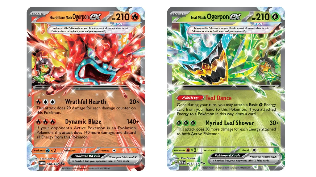 Ogerpon Pokémon TCG debütálása nagy ügy, és a Pokémon Co. International ennek megfelelően ünnepli: Hat új kártya a Scarlet & Violet — Twilight Masquerade kiegészítőből került felfedésre. A játékosok alig várhatják, hogy hozzáadják a Teal Mask Ogerpon ex, Hearthflame Mask Ogerpon ex, Wellspring Mask Ogerpon ex, Cornerstone Mask Ogerpon ex, Teal Mask Ogerpon, és Ogre’s Mask kártyákat a csatáikhoz.