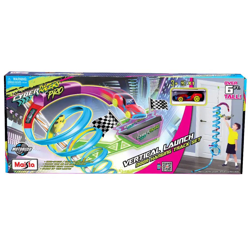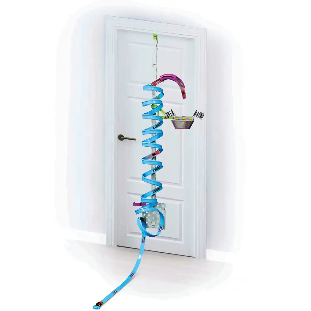 A pálya könnyedén rögzíthető az ajtó tetejére, majd onnan egészen a padlóig fut le. A speciális gravitációs rendszernek köszönhetően nincs szükség motoros hajtásra vagy elemekre, így a gyerekek akár újra és újra elindíthatják a járművet, hogy lenyűgöző sebességgel és lendülettel érjen célba.