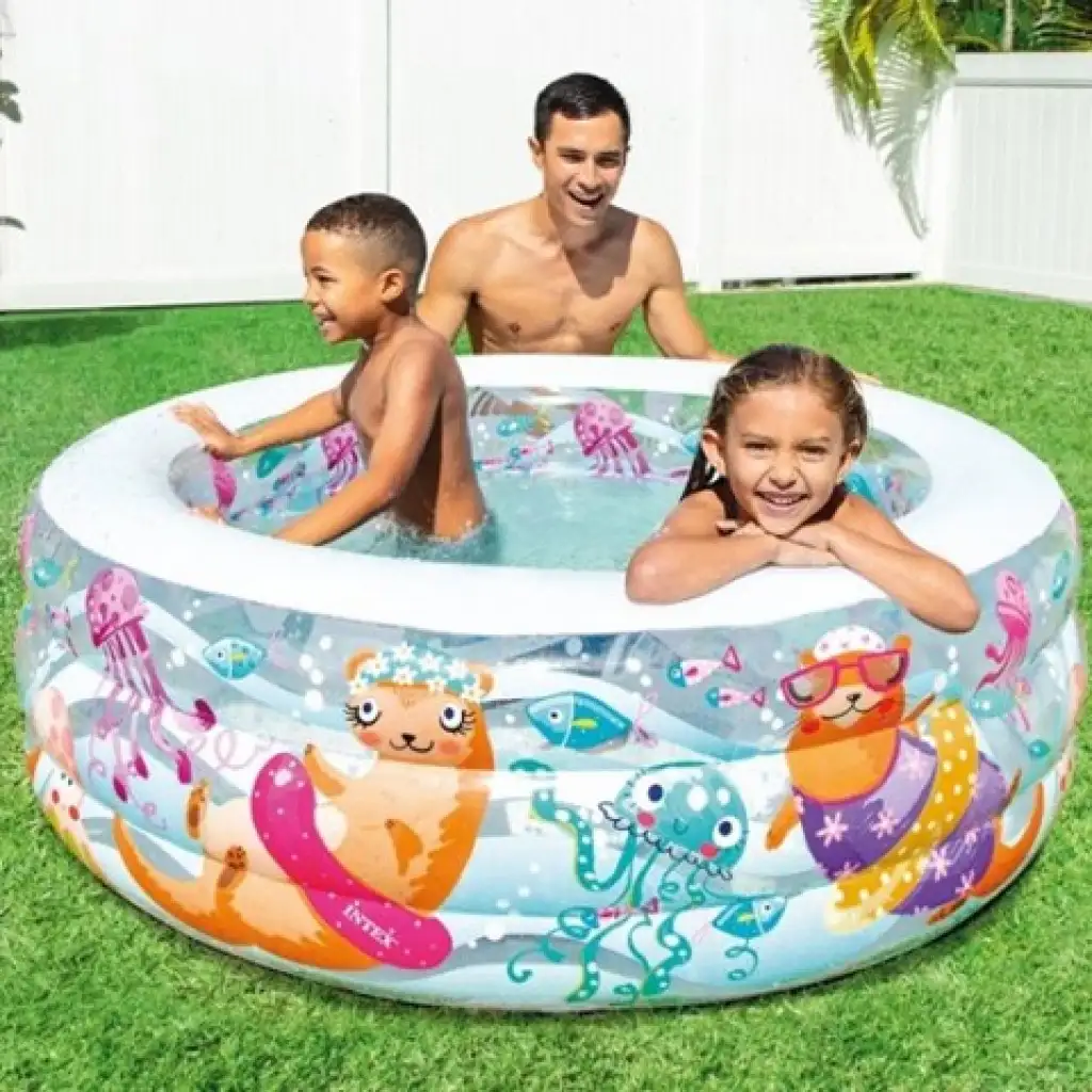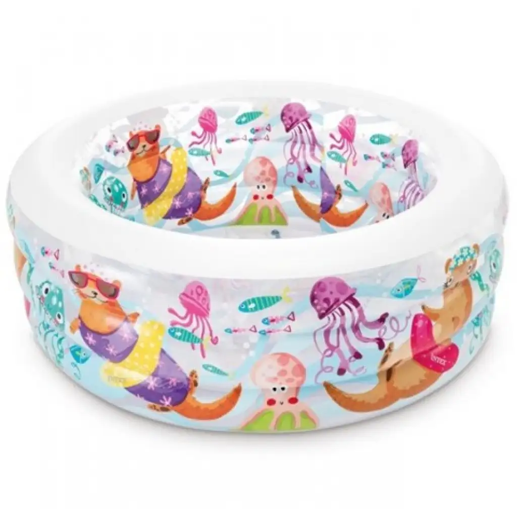 Legyen saját medencéd, amit akár otthon a kertben is felállíthatsz, ha egy kis hűsítő fürdésre vágysz! A medence három gyűrűje átlátszó, valamint tengeri világgal díszített, ezzel fokozva még inkább a játék hangulatát. Nincs más dolgod mint felfújni, tele engedni vízzel, és már pancsolhatsz is!