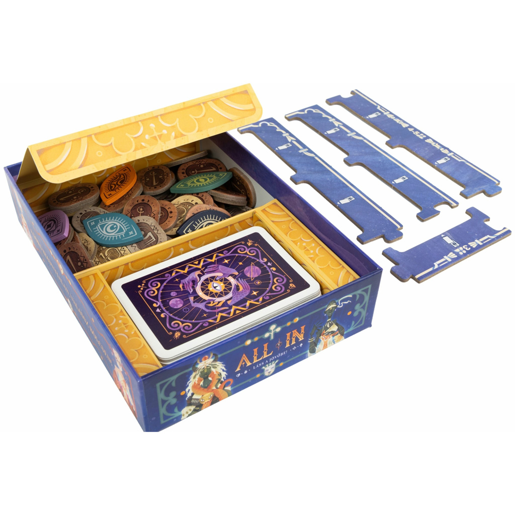 Az All In – Láss a jövőbe! társasjáték egy izgalmas és különleges kártyajáték, amelyben gyermekeddel együtt próbálhatjátok meg kifürkészni az ellenfelek lépéseit és előre gondolkodni. A látványos, misztikus grafikák azonnal beszippantanak, miközben a játék folyamatos döntések elé állít. A cél, hogy minél ügyesebben gazdálkodjatok a lapjaitokkal és zsetonjaitokkal, és a megfelelő pillanatban „all in”-t mondjatok.