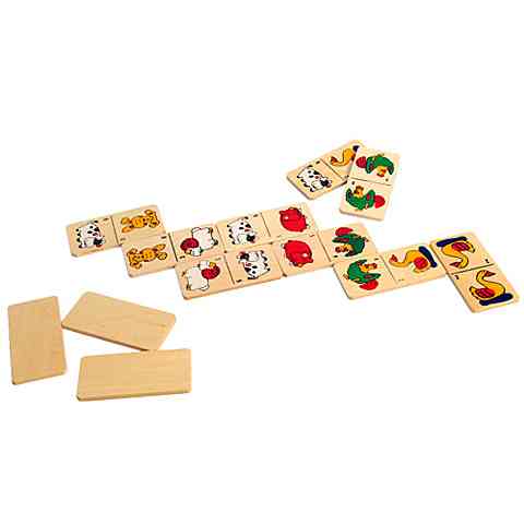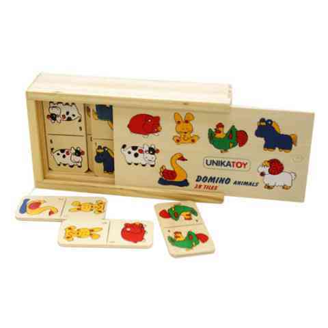 A legkisebb gyerekek számára készült, igazán színes és kiváló minőségű fa dominójáték, melyen a klasszikus számozás helyett állatok képeit találják a gyerekek. A játék lényege, hogy a dominósort folyamatosan építsék a játékosok úgy, hogy csakis a megegyező képek érhetnek össze. Az a játékos akinek elsőként elfogy az összes dominója, megnyeri a játékot!