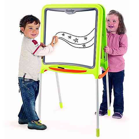 A kétoldalas rajztáblán a gyerekek szabadon rajzolhatnak, hiszen alkotásaik elkészítéséhez nagy felület áll rendelkezésre. A mágneses táblára nem csak rajzolhatnak, de akár betűket is illeszthetnek a játék során. Az állványos rajztábla fém lábakon áll, így az masszív, strapabíró szerkezetű. A tábla kis polca elegendő helyet garantál a kellékek tárolásához.