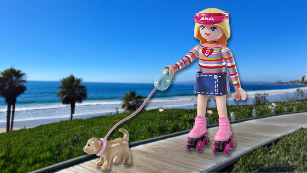 A kollekció első darabján Barbie látható, amint görkorcsolyázik és közben egy kutyát sétáltat. Ez a jelenet vidám, lendületes hangulatot áraszt, és tökéletesen bemutatja Barbie aktív, modern életstílusát. A színes, részletgazdag megjelenítés minden korosztály számára vonzóvá teszi ezt a különleges figurát, amely a Playmobil kreativitását és minőségét tükrözi.