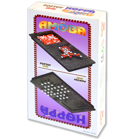 Két vagány játék egyetlen dobozban! A Poptoynak köszönhetően két szórakoztató játékban teheted próbára magad. Az egyik játék az Amőba, amit két játékos játszhat. kezdésnek osszátok szét a tüskéket szín szerint, ezután a játékosok felváltva helyezhetnek el egy tüskét a táblán. A játékot az nyeri, akinek sikerül öt tüskét elhelyeznie egymás mellett vízszintesen, függőlegesen vagy átlósan. A Hoppá egy remek unaloműző, amivel magányodban trenírozhatod magad. Kezdésnek a kereszt alakú lyukas terület középső lyukát leszámítva minden lyukba kell egy tüskét szúrni. Ez után egy tüskével átugorhatunk egy másikat, amit le kell vennünk. Ha sikerül úgy ugrálni, hogy egyetlen tüske maradjon, akkor büszke lehetsz magadra.