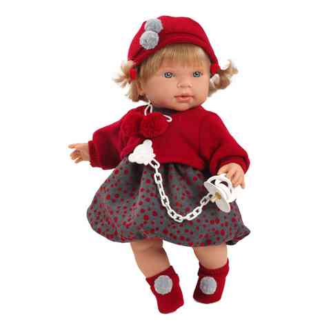 A piros színvilág és a pettyes szoknya miatt ez a baba leginkább Piroskára emlékeztet. Haja különböző copfokba gumizható, fésülhető. Öltöztethető, vetkőztethető, ruházata tisztán tartható. Öltözéke pom-pomos piros zokniból, piros, pom-pomos pulcsiból és sapkából áll.