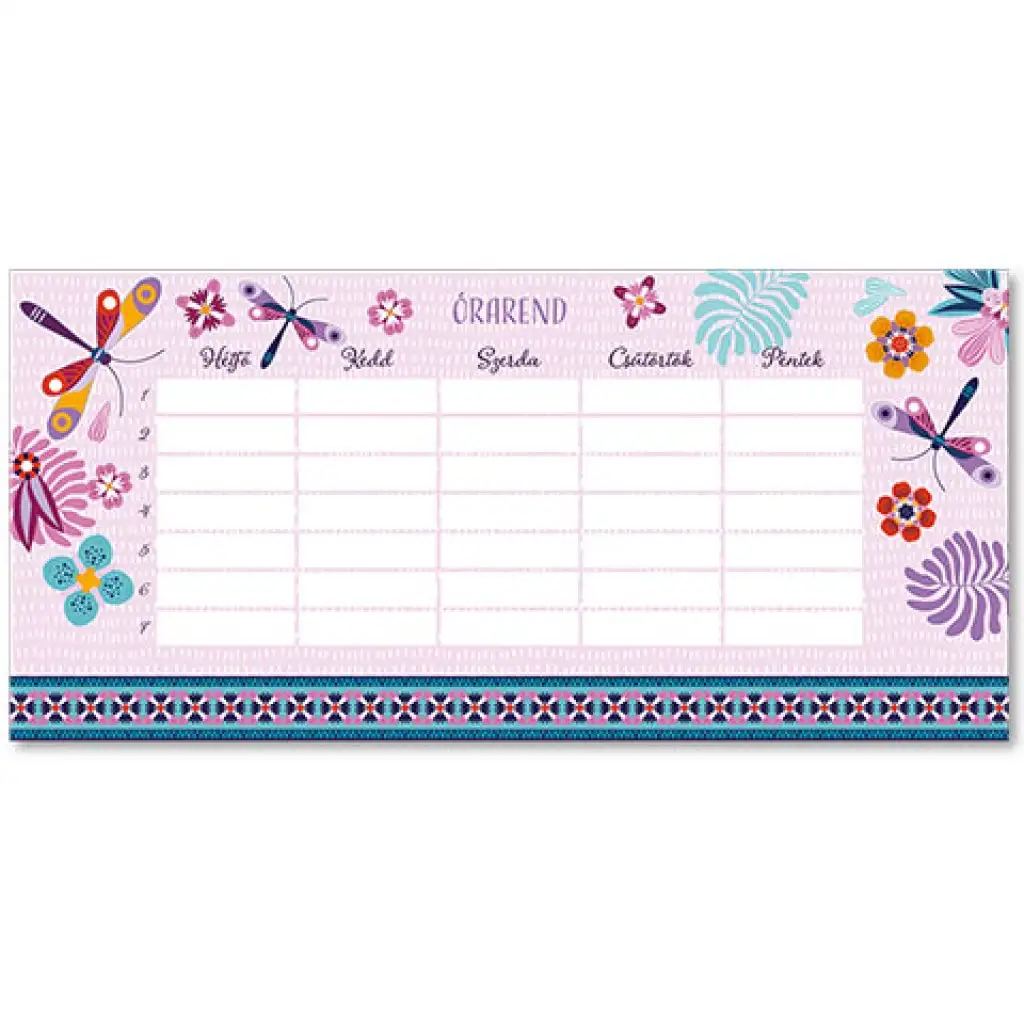 Ezzel a remek órarenddel mindig pontosan tudni fogod, hogy melyik órára kell menned, illetve, hogy a következő napra mely házi feladatoknak kell elkészülnie. A virágokkal és szitakötőkkel díszített órarend két oldalas, így A és B hetet is tudsz rajta jelölni. Az órarend magyar nyelvű, 250g-os félfényes műnyomópapírból van, melynek csodásak a színei és tollal valamint ceruzával is tudsz majd írni rá. Az órarend belefér a legtöbb tolltartóba is, hogy mindig kéznél és szem előtt legyen.