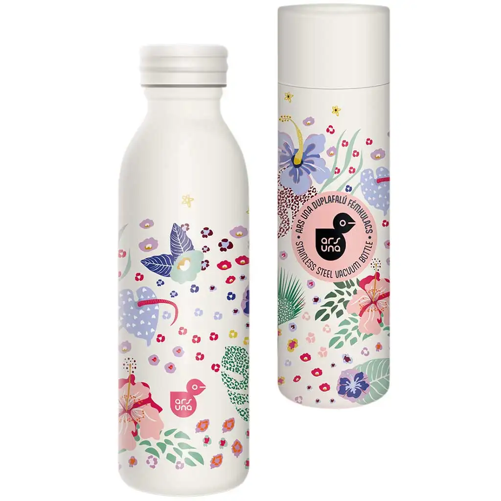 Az Ars Una Cream Hibiscus duplafalú fém kulacs nemcsak praktikus, hanem lenyűgöző designjával is magára vonja a figyelmet. A világos, krémszínű alapszínen különböző színes, egzotikus virágok és levelek tűnnek fel, amelyek természetközeli és friss hangulatot sugároznak. Ez a 600 ml-es kulacs tökéletes választás lehet mindennapi használatra, akár iskolába, munkahelyre vagy utazáshoz viszed magaddal. A stílusos díszdoboz miatt pedig igazán különleges ajándék is lehet.