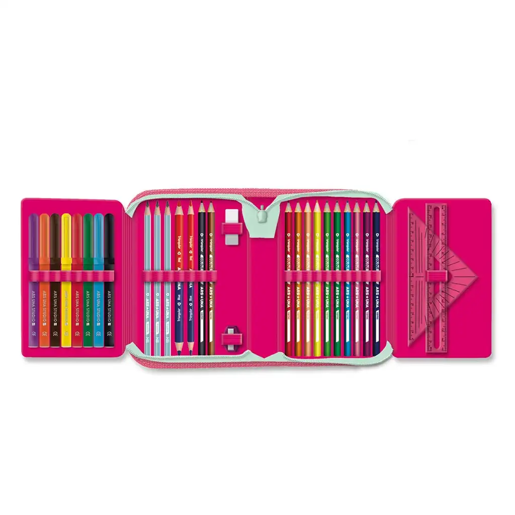 A cipzáras kialakítás könnyű hozzáférést biztosít, a tartalma pedig egy teljes felszerelést kínál: színes ceruzák, filctollak, grafitceruzák, radír, hegyező és vonalzók is megtalálhatók benne – mindezek gondosan rendszerezve, hogy gyermeked könnyedén eligazodjon közöttük.