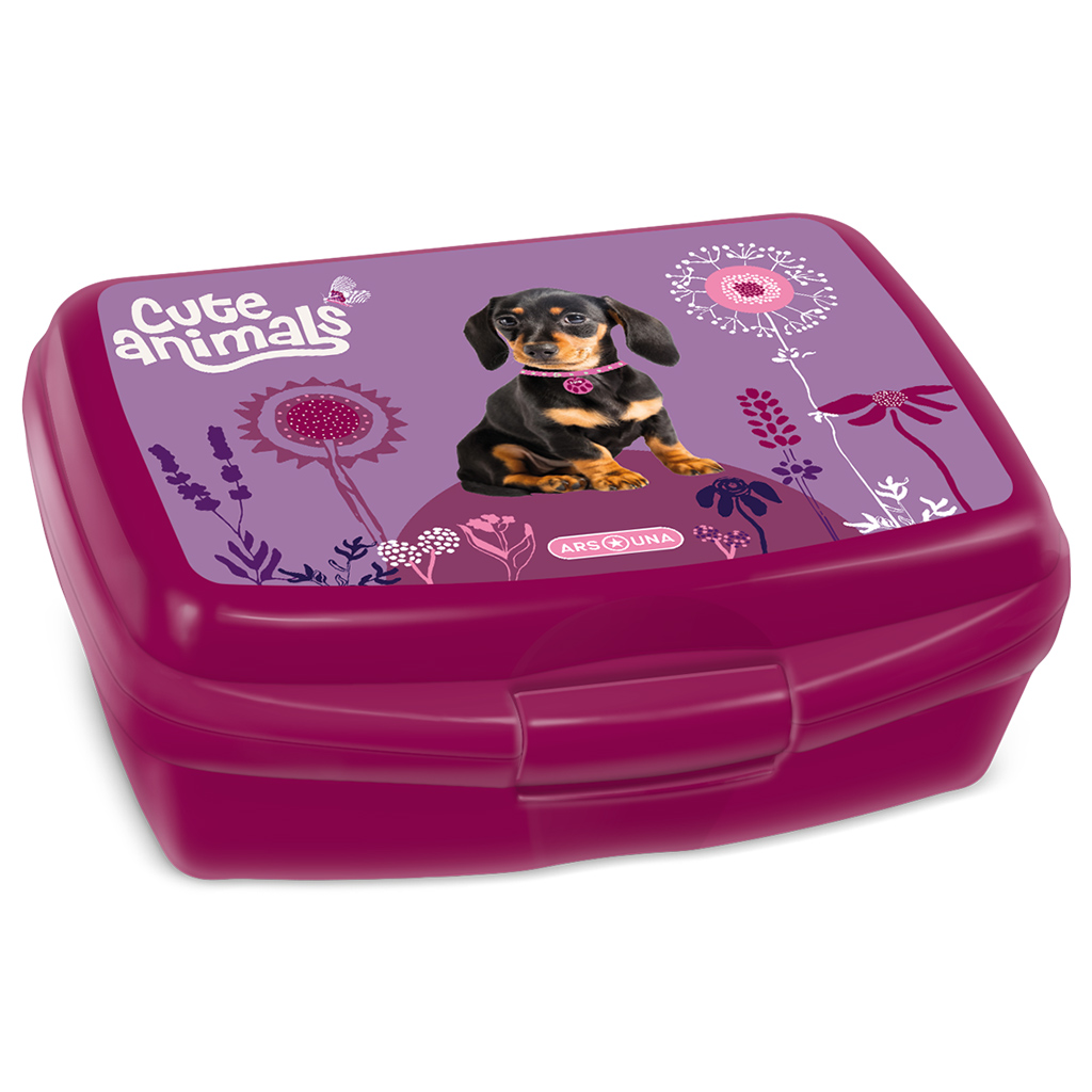 Az Ars Una Cute Animals - Puppy uzsonnás doboza tökéletes választás gyermeked számára, ha kedveli a cuki állatokat, különösen a kiskutyákat. Ez a zárható műanyag uzsonnás doboz tacskós mintával van díszítve, amely színt és vidámságot visz a mindennapokba.