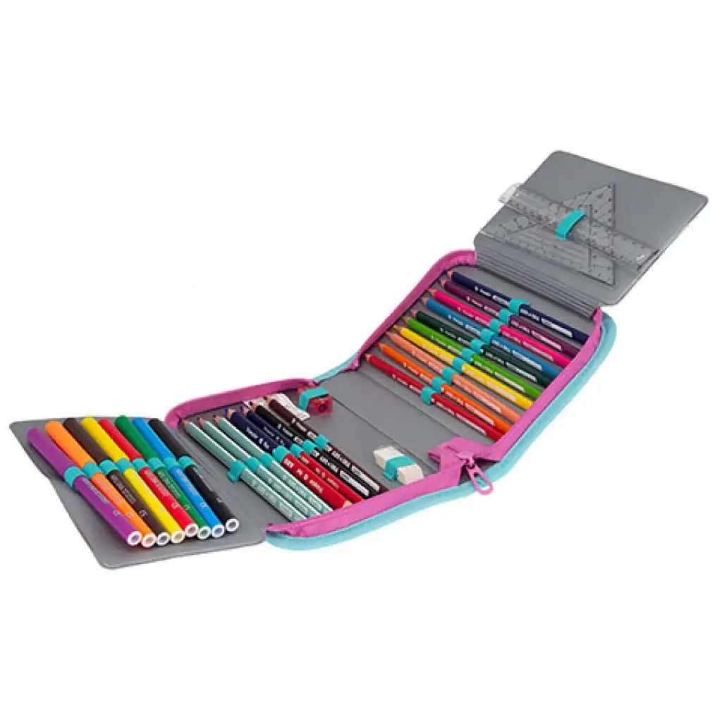 A rózsaszín és a többi világos, élénk szín egy varázslatos világot teremtenek a kislányok számára, főleg ha ezekkel a színekkel egy tolltartó van befestve. Minden osztálytársad figyelmét elnyered és arra is kíváncsiak lesznek, hogy kihajtva mi van a tolltartódban. Természetesen a színes ceruzák mellett olyan hasznos dolgok sem hiányozhatnak, mint a grafit ceruzák, a radír, a vonalzó és a hegyező. A tolltartó cipzárral zárható, így biztonságosan hordozható, a benne lévő számtalan írószer, ami az iskolakezdésnek megfelelően lett összeválogatva.