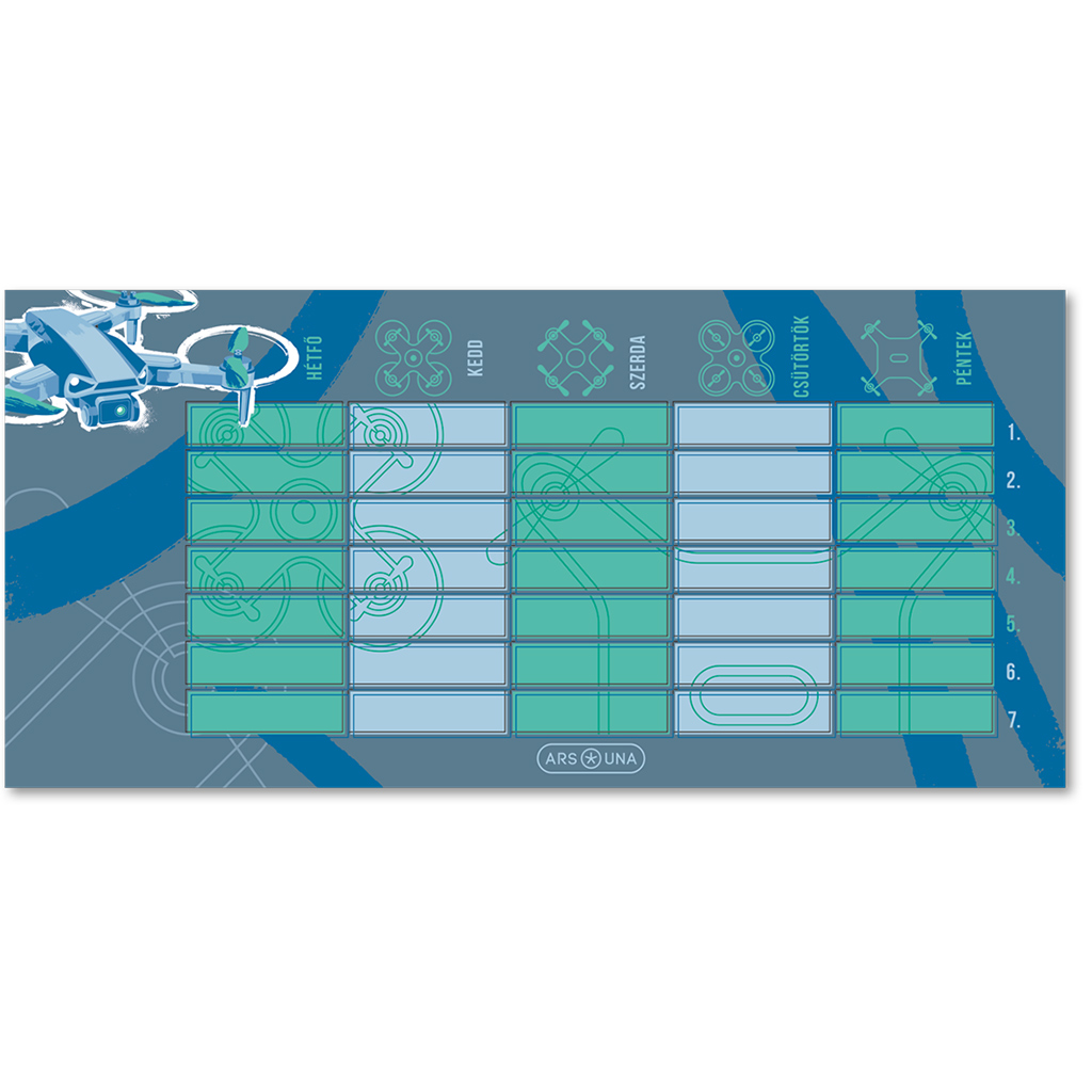 Ha gyermeked rajong a technikáért, a kütyükért és a repülés világáért, akkor a Drone Pro órarendet imádni fogja! Ez a vagány, drónos dizájnnal ellátott órarend a modern technológia iránt érdeklődő fiúknak (és vagány lányoknak is) készült. A hűvös kék és zöld árnyalatok, valamint a futurisztikus grafikák igazán különlegessé teszik a megjelenését, miközben segítenek rendszerezni az iskolai hetet.