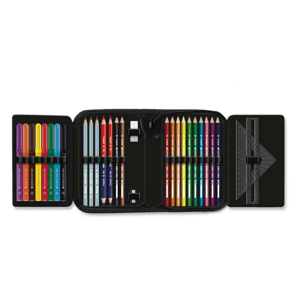 A tolltartó praktikus belső kialakítása révén nemcsak mutatós, de minden szükséges eszközt is tartalmaz. A 12 db színes ceruza, 3 grafitceruza, filctollak, radír, hegyező és a kétféle vonalzó mellett a tanulók az A-B hetes órarenddel is rendszerezhetik óráikat. Strapabíró cipzárral záródik, és könnyedén elfér az iskolatáskádban is.