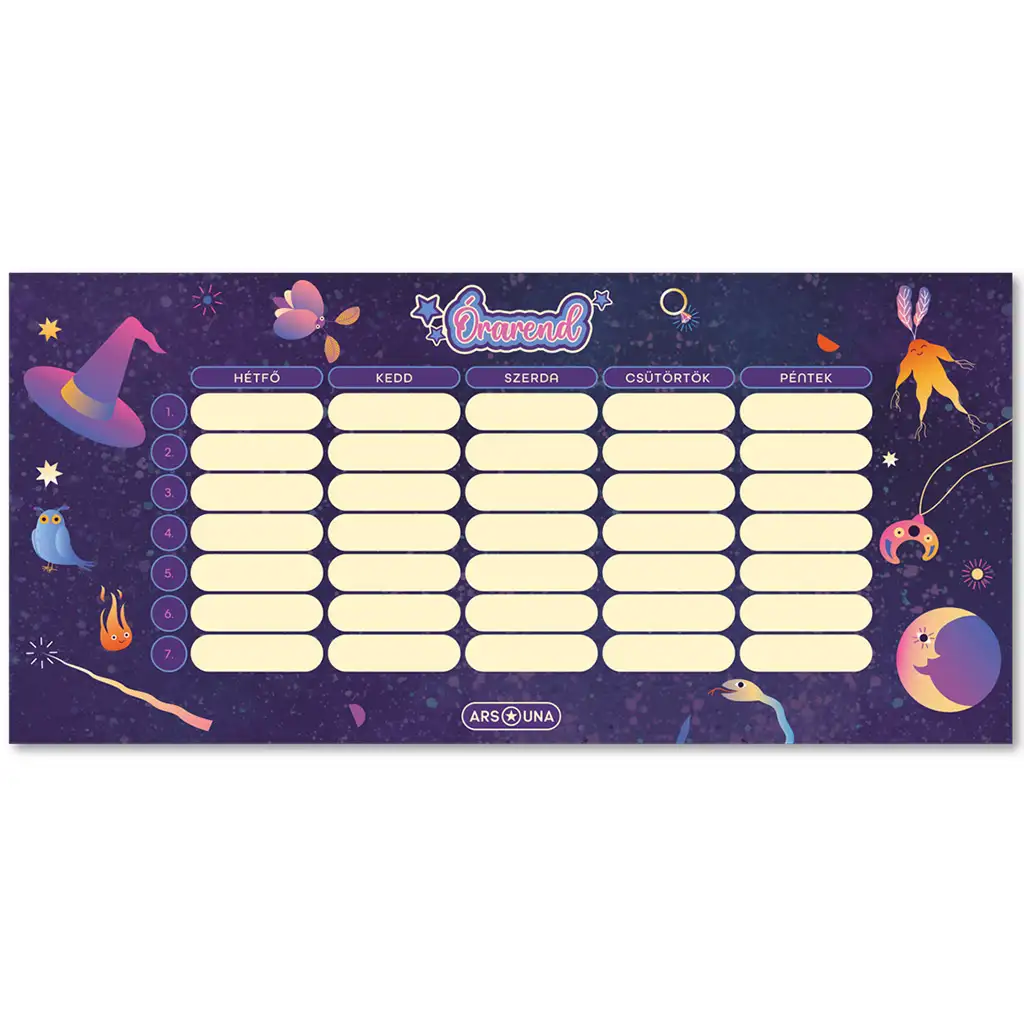 Ismerd meg az Ars Una Enchanted boszis órarendjét, mely egy varázslatos és stílusos kiegészítő minden varázslatos témákat kedvelő lány számára. Ez az órarend sötétlila alapon boszorkányos mintákkal van díszítve, így nemcsak praktikus, hanem misztikus és egyedi hangulatot is áraszt, ami megihlet minden napod során.