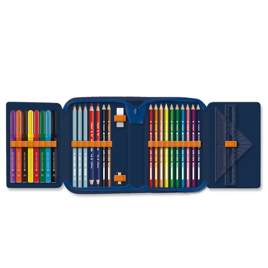A tolltartóban számos különböző eszköz található, hogy minden tanuló megtalálja a számára legmegfelelőbbet. 12 darab háromszögletű színes ceruza biztosítja a könnyű fogást és kényelmes írást. Ezen kívül három darab HB grafit ceruza, valamint egy vékony és egy vastag postairón is rendelkezésre áll, hogy a jegyzetelés mindig könnyed és precíz legyen.
