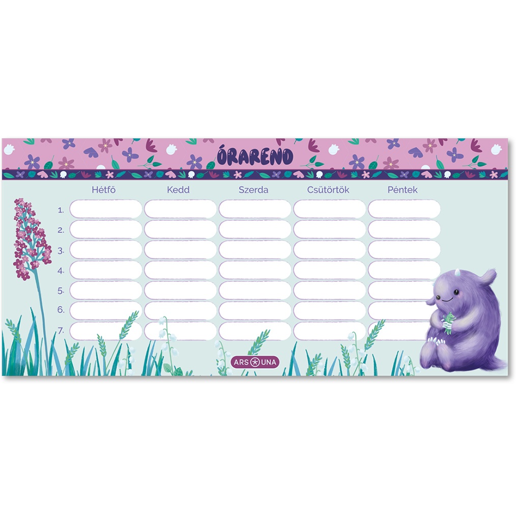Varázsold meséssé a tanítási hetet az Ars Una Mon Mignon órarenddel, amelyet egy elbűvölő kis lila szörnyecske tesz igazán szerethetővé! A bájos grafika, a pasztell színek és a vidám virágminták tökéletesek azoknak a gyerekeknek, akik szeretik az aranyos, álomszerű hangulatot és örömmel díszítenék ezzel a szobájukat vagy az iskolai felszerelésüket.