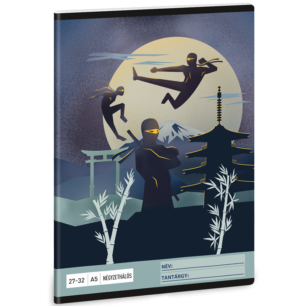 Varázsold izgalmassá gyermeked iskolai felszerelését ezzel a Ninjas in the Dark négyzethálós füzettel! Az A/5 méretű, 32 lapos füzet borítóján vagány ninják jelennek meg egy titokzatos, holdfényes japán tájban. A háttérben pagoda, bambusz és tradicionális kapu (torii) rajzolódik ki, mindez sötét, éjszakai hangulatot áraszt, amely garantáltan elnyeri a harcművészetek és a kalandos történetek rajongóinak tetszését. Ez a stílusos grafika inspirálja a gyerekeket, és örömmel fogják elővenni a füzetet a matematika- vagy technikaórán.