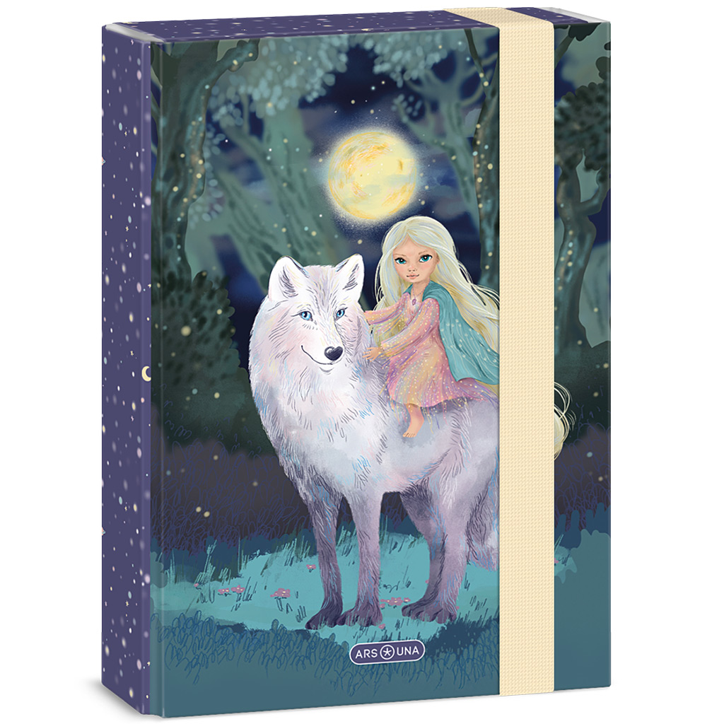 Az Ars Una: Northern Lights füzetbox A/5 tökéletes választás, ha gyermekednek egy igazán különleges és praktikus tárolóra van szüksége. A varázslatos, éjszakai erdei jelenetben egy kislány és egy fehér farkas látható a holdfényben, ami mesés hangulatot kölcsönöz a mindennapoknak. Nemcsak szép, hanem rendkívül hasznos is: segít rendszerezni a füzeteket, rajzokat és fontos iskolai iratokat. A strapabíró, kemény karton borítás megvédi a tartalmát a gyűrődéstől, míg a rugalmas gumipánt biztosan zárva tartja a füzetboxot még a táskában is.