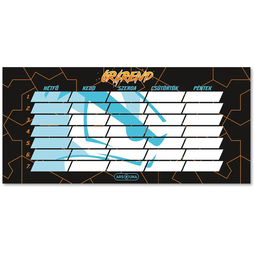 Ismerd meg az Ars Una Player One órarendjét, amely egy dinamikus és stílusos kiegészítő minden gamer diák számára. Ez az órarend fekete alapon narancssárga vonalas mintával van díszítve, így nemcsak praktikus, hanem vagány és modern megjelenést is biztosít, ami minden napodat feldobja.
