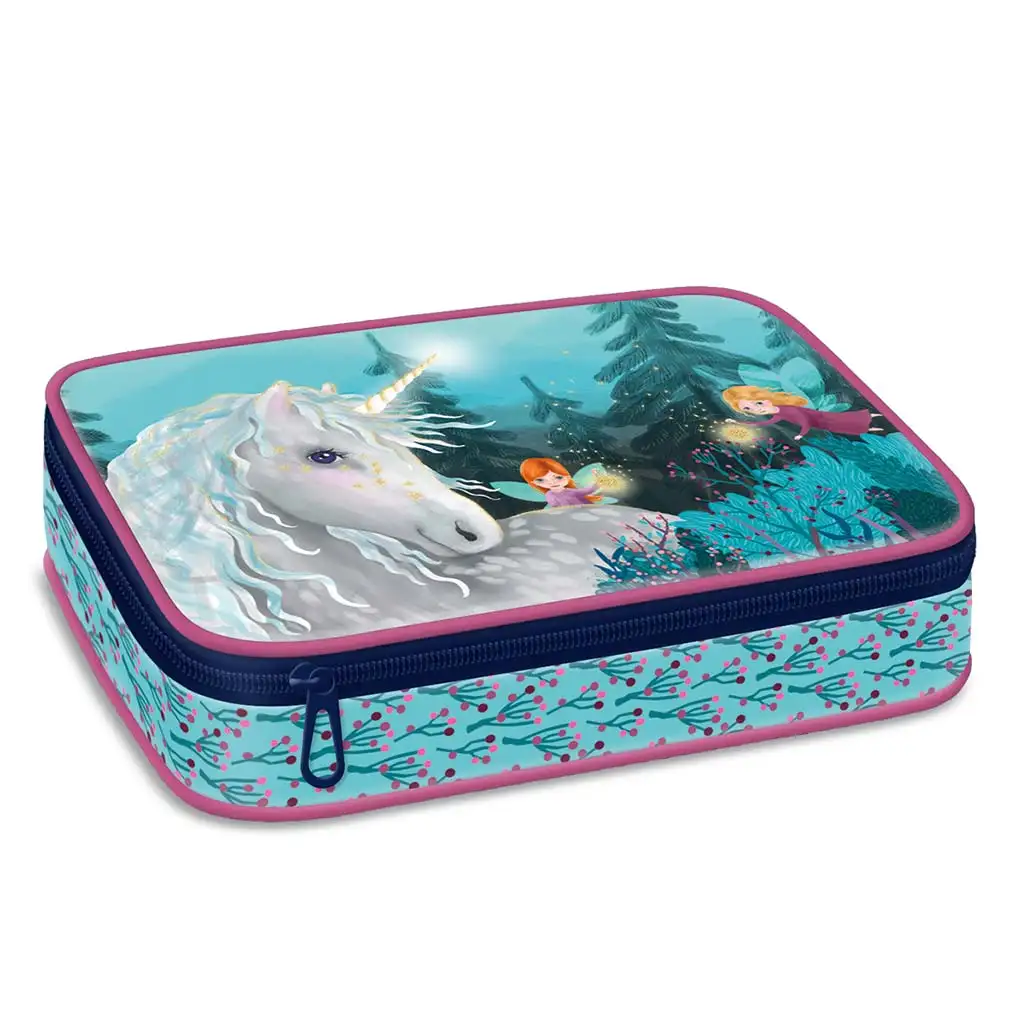 A Stardust többszintes tolltartó egy igazi varázslatos világot hoz el az iskolába! A csillogó szarvú fehér unikornis és a tündérek mesebeli jelenete minden kisdiák fantáziáját megmozgatja, miközben a tolltartó praktikus kialakítása segíti a napi rendszerezést. A világoskék és rózsaszín alapszín vidám, erdei mintával díszített, ami még különlegesebbé teszi ezt az iskolai kiegészítőt.