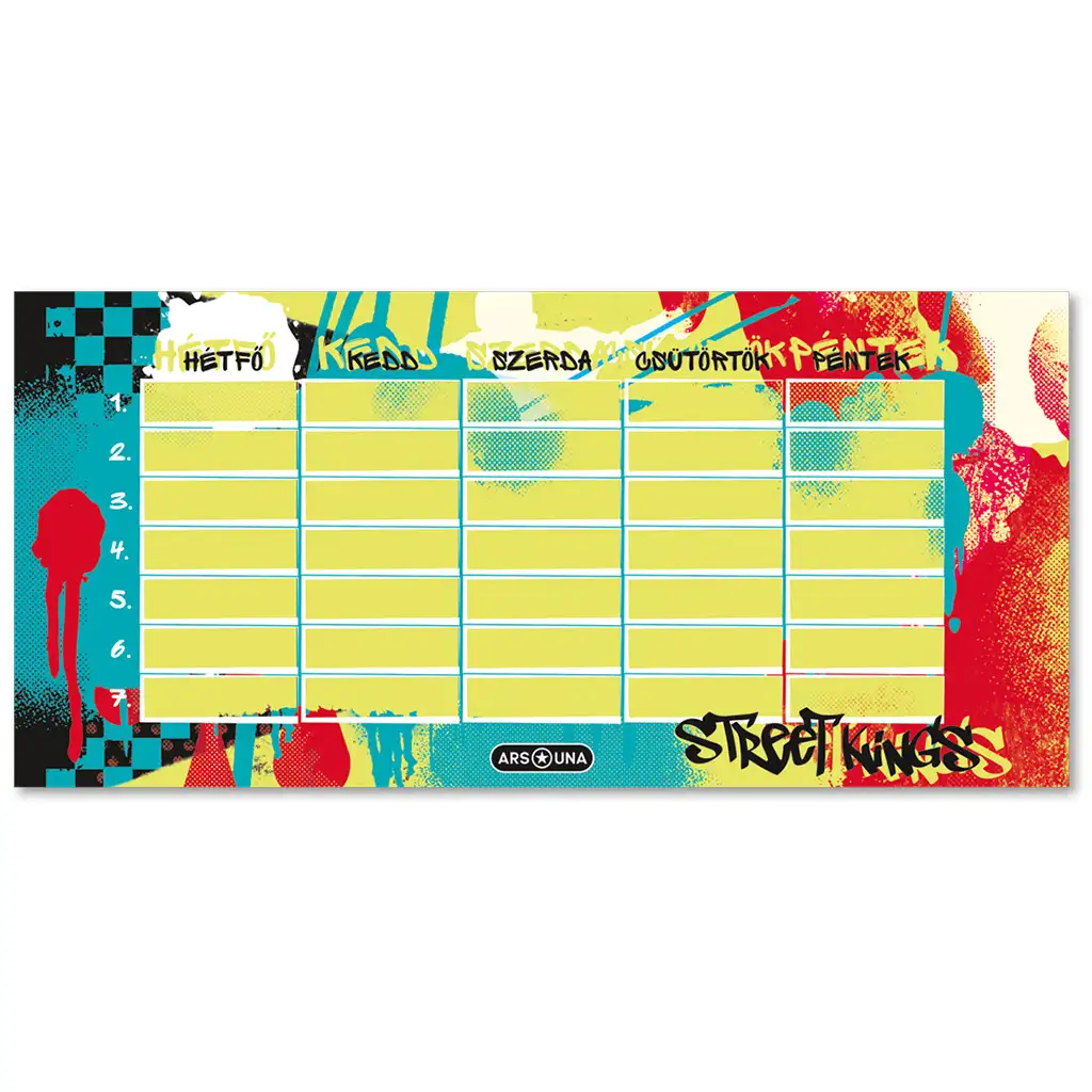 Ismerd meg az Ars Una Street Kings órarendjét, amely egy igazán vagány és stílusos kiegészítő minden street artot kedvelő diák számára. Ez az órarend színes graffiti mintával van díszítve, így nemcsak praktikus, hanem egyedi és energikus megjelenést is kölcsönöz, ami inspirál minden napod során.