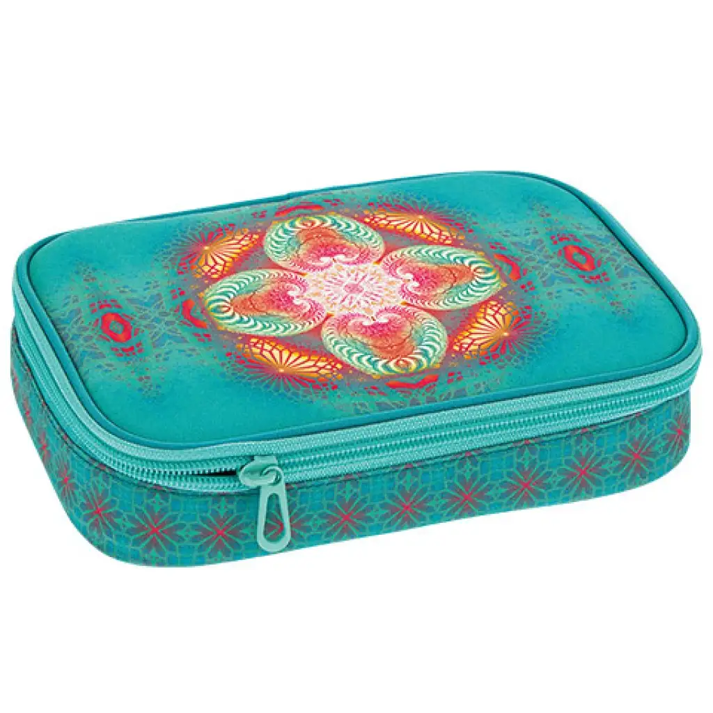 A Mandala Turquoise Hope egy igazán különleges kialakítás egy tolltartó számára. Ennek színe és mintája nem mindennapos, pontosan ez az az elem, amely rögtön megfogja az iskolásokat és amiért megtetszik nekik. Ennek a többszintes kihajtható tolltartónak a belseje elég nagy ahhoz, hogy egy iskolás minden írószerét belehelyezze. Kiváló minőségének köszönhetően sokáig lehet majd használatban. Cipzáras zsebét kinyitva belül lapozható oldalak találhatóak, melyekben 30 + 4 írószer fér el, ráadásul még egy beépített tolltartó is megtalálható benne, ami további helyet biztosít a ceruzáknak és tollaknak.