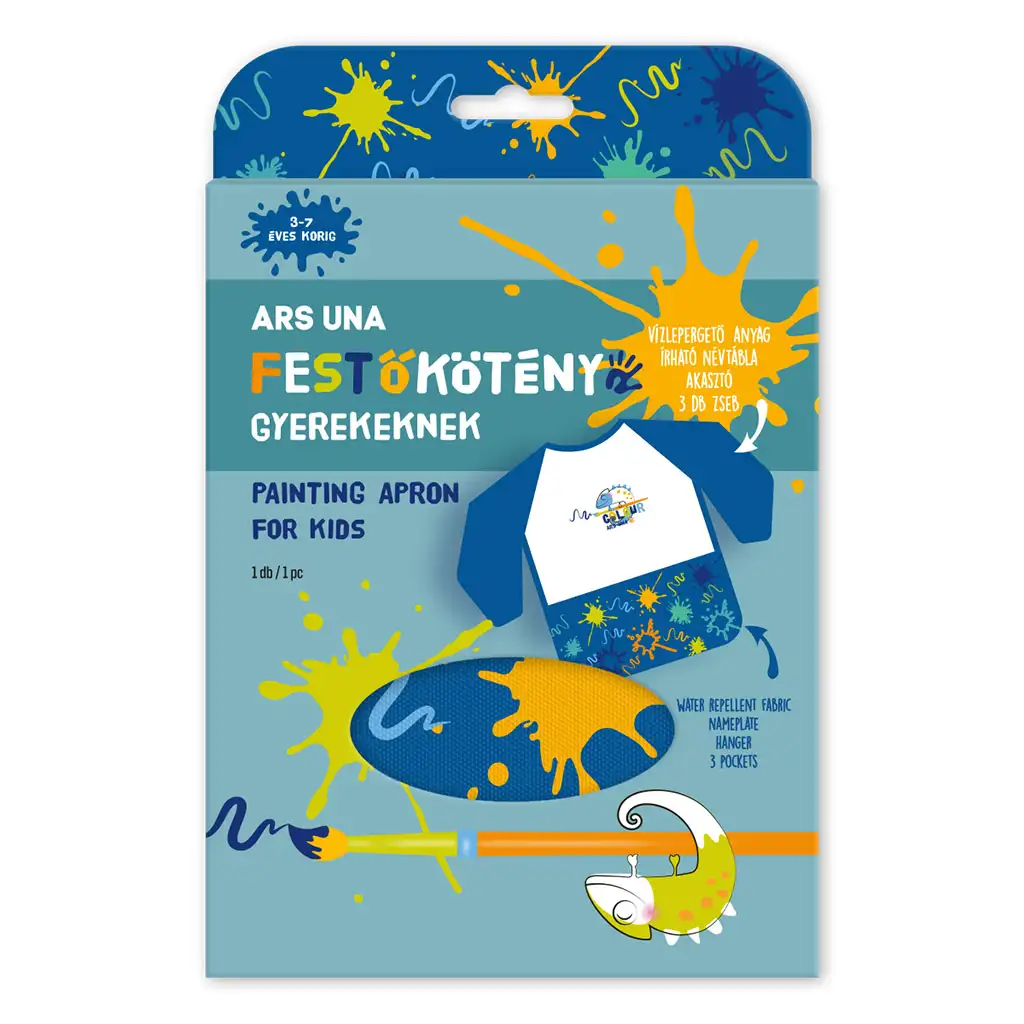 A Blue Splash hosszú ujjú festőkötény ideális választás minden kreatív kisgyerek számára, aki imád festeni, rajzolni vagy barkácsolni! Ez a vízlepergető anyagból készült kötény megóvja a ruhákat a festék-, ragasztó- és egyéb szennyeződésektől, így a gyereked szabadon alkothat anélkül, hogy aggódnál a foltok miatt. A hosszú ujjú kialakítás még teljesebb védelmet biztosít, a kötény alján található három zseb pedig tökéletesen alkalmas ecsetek, ceruzák vagy akár apró kincsek tárolására. A nyakrésznél található akasztó segítségével könnyen felakasztható, az írható névtábla pedig garantálja, hogy sosem keveredik el az oviban vagy az iskolában. A vidám kék alapszín, a színes pacák és a kis kaméleon figura még szórakoztatóbbá teszik az alkotást!